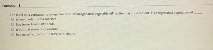 Biology Chapter 5 Flashcards - Quizlet 22) The label on a container of margarine lists "hydrogenated vegetable oil" as the major ingredient. Hydrogenated vegetable oil _____. A) is solid at room temperature B) has more "kinks" in the fatty acid chains C) has fewer trans fatty acids D) is less likely to clog arteries A 23) Saturated fatty acids _____.