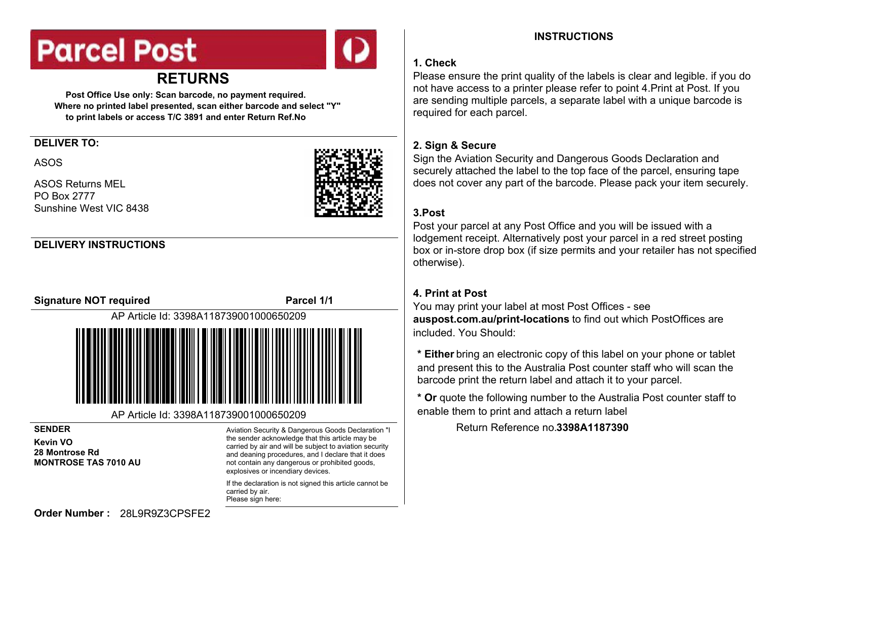ASOS Returns - parcelpoint.com.au ASOS Returns Thanks Amelia, your return using Australia Post has been booked What happens next? 1. Download and print your label Download your label After the label downloads, open and print the file. If you don't have access to a printer right now, we have also emailed you the label so you can print it later. 2. Package item and attach label