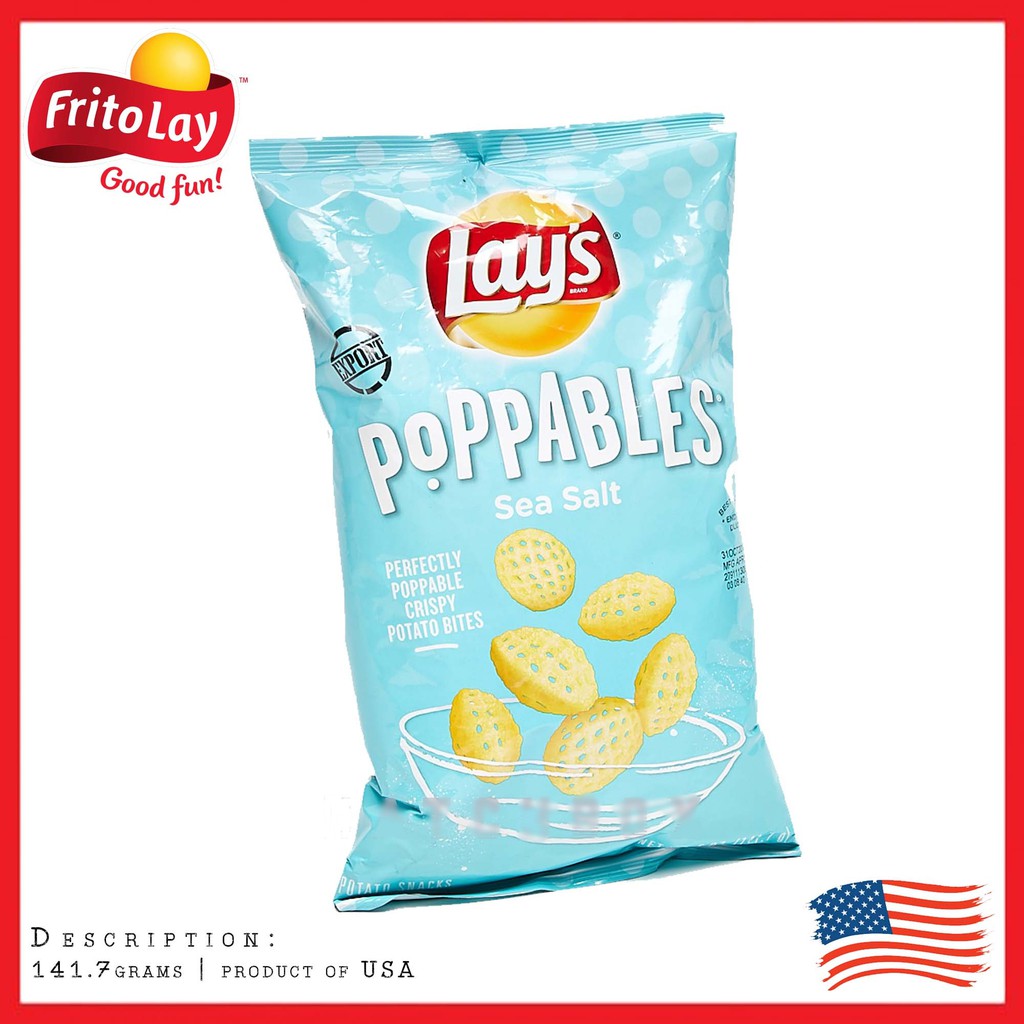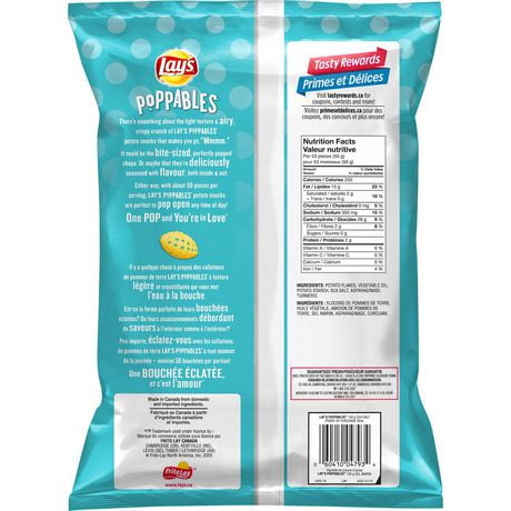 LAY'S® Poppables™ Sea Salt Potato Snacks Description. Perfectly popped, perfectly salted with delicious sea salt, these crispy potato puffs are light and airy. With 28 pieces per serving, you'll be sure to keep on popping! Nutrition Facts. Information about serving. Serving size About 28 pieces (28g) Amount per serving Calories 150.