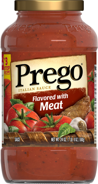 Prego with Meat Italian Sauce, 45oz Nutrition Facts NUTRITION LABEL (% of daily value based on 2000 calories per day) Nutrition Facts. Prego with Meat Italian Sauce, 45oz. Serving Size: cup (250g) * Amount Per Serving ; Calories: 157.5 cal : Calories from Fat: 55.8 cal % Daily Value : Total Fat: 6.2 g : 9.5%: Saturated Fat : 1.5 g : 🔒% Cholesterol: