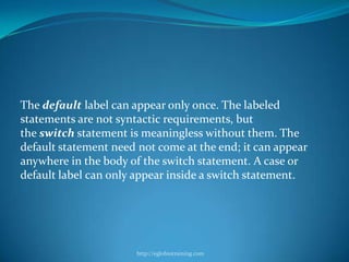Why do I get "a label can only be part of a statement and a declaration ... ANSWER: The language standard simply doesn't allow for it. Labels can only be followed by statements, and declarations do not count as statements in C. The easiest way to get around this is by inserting an empty statement after your label, which relieves you from keeping track of the scope the way you would need to inside a block. Interesting facts about switch statement in C - GeeksforGeeks Choice is 2. Following are some interesting facts about switch statement. 1) The expression used in switch must be integral type ( int, char and enum). Any other type of expression is not allowed. #include . int main () {. float x = 1.1; switch (x) Labels (x86 Assembly Language Reference Manual) - Oracle A numeric label consists of a single digit in the range zero (0) through nine (9) followed by a colon (:). Numeric labels are used only for local reference and are not included in the object file's symbol table. Numeric labels have limited scope and can be redefined repeatedly. When a numeric label is used as a reference (as an instruction ... How to use typeof, statement expressions and Block-scope label ... - Oracle A compound statement, which we use in the macro definition to limit the scope of the local variables, can not return a value. However, statement expressions can. That is the second language extension to be discussed in this article. Using Statement Expressions. A compound statement enclosed in parentheses represents statement expression.