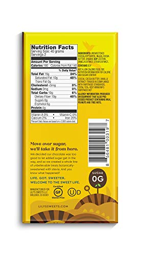Lilys chocolate nutrition label. Lily's Baking Chips Dark Chocolate -- 9 oz - Vitacost Lily's Baking Chips Dark Chocolate Description Less Sugar. Sweet Life. Stevia Sweetend 55% Cocoa No Sugar Added Non-GMO Project Verified 25% Fewer Calories-100% Indulgence. Our Chocolate is sweetened with Stevia, a zero calorie, natural sweetener. Prized for its many health benefits, Stevia has sweetened foods and beverages for centuries. Lily's - Milk Chocolate Bars - Creamy Milk 40% - 85 g Lily's - Milk Chocolate Bars - Creamy Milk 40% - 85 g · Ingredients: Unsweetened Chocolate, Cocoa Butter, Erythritol, Inulin, Dextrin, Whole Milk Powder (rBST ... Calories in Lily's Dark Chocolate and Nutrition Facts Nutrition Facts Serving Size 1/2 bar (40 g) Amount Per Serving Calories 160 % Daily Values* Total Fat 15.00g 19% Saturated Fat 9.000g 45% Trans Fat 0.000g Cholesterol 0mg 0% Sodium 5mg 0% Total Carbohydrate 22.00g 8% Dietary Fiber 18.0g 64% Sugars 0.00g Protein 2.00g Vitamin D - Calcium - Iron - Potassium - Lily's Nutrition Facts. Calories, carbs, fat, sodium & more - MyFoodDiary Lily's Salted Caramel Milk Chocolate Bar. 0.5 bar (30g) Nutrition Facts. 130 calories. Log food. Lily's Coconut Dark Chocolate Bar. 1 ⁄ 3 bar (30g) Nutrition Facts. 140 calories.