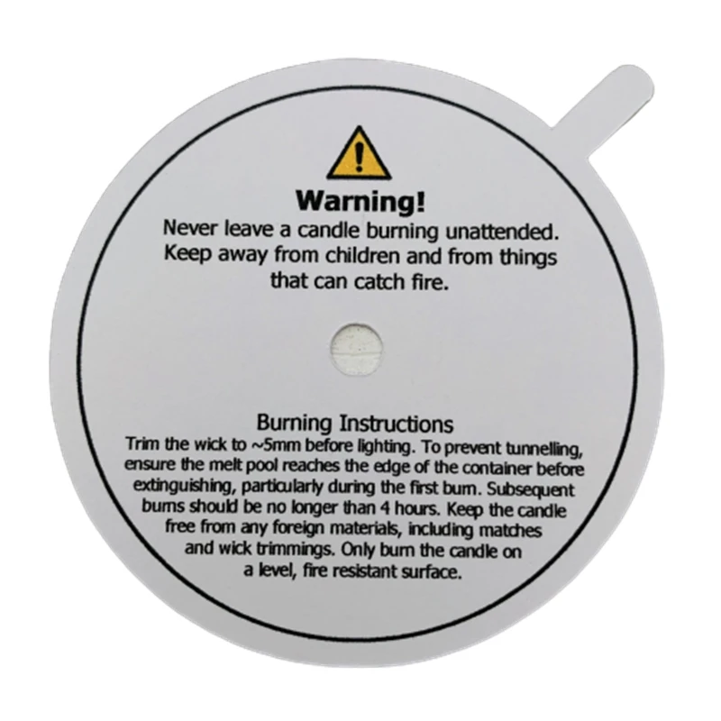 Candle Warning Labels CONTAINER WARNING LABELS - Adhesive backed white semi-gloss face printed with black ink with candle container burning instructions. VOTIVE WARNING LABELS - 1 1/4" stock votive warning labels read, "Remove Label, Never burn candles unattended, burn in holder". PILLAR WARNING LABELS - 2" warning labels for candle pillars.