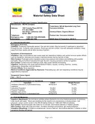 PDF Material Safety Data Sheet (MSDS) - WD-40 Trade Name: WD-40 Multi-Use Product Bulk Liquid Chemical Name: Mixture Product Use: Lubricant, Penetrant, Drives Out Moisture, Removes and Protects Surfaces from Corrosion Restrictions on Use: None identified SDS Date Of Preparation: August 3, 2021 Manufacturer: WD-40 Company Address: 9715 Businesspark Avenue San Diego, California, USA 92131 PDF Material Safety Data Sheet (MSDS) - WD-40 Product Name: WD-40 Specialist ® Degreaser - Industrial Strength Product Use: Degreaser Restrictions on Use: None identified SDS Date Of Preparation: 8/9/18 Manufacturer: WD-40 Company Address: 9715 Businesspark Avenue San Diego, California, USA 92131 Telephone: Emergency: 1-888-324-7596 Information: 1-888-324-7596