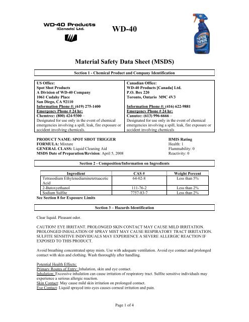 Search | WD-40 Submit a search to find and learn more about WD-40 products including classic WD-40 spray as well as degreasers, lubricants and rust inhibitors. Products. All. By Product Line SEE ALL WD-40 ® Multi-Use ... Home - WD-40 Canada WD-40 protects metal surfaces with corrosion-resistant ingredients to shield against moisture and other corrosive elements. Cleans. WD-40 gets under grease, grime, oil & dirt. WD-40 formulas also dissolve adhesives, allowing easy removal of labels, tape, stickers and excess bonding material. PDF Material Safety Data Sheet (MSDS) - WD-40 the WD-40 Safety Hotline at 1-888-324-7596 immediately. Eye Contact: Flush thoroughly with water. Remove contact lenses if present after the first 5 minutes and continue flushing for several more minutes. Get medical attention if irritation persists. Skin Contact: Wash with soap and water. If irritation develops and persists, get medical attention. PDF Material Safety Data Sheet (MSDS) - mrsi.org or the WD-40 Safety Hotline at 1-888-324-7596 immediately. Eye Contact: Flush thoroughly with water. Remove contact lenses if present after the first 5 minutes and continue flushing for several more minutes. Get medical attention if irritation persists. Skin Contact: Wash with soap and water. If irritation develops and persists, get medical ...