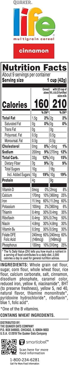 Quaker Life Cereal Cinnamon 18oz Box | Garden Grocer Quaker Life Cinnamon Multigrain Cereal.EST 1877.18 Grams Whole grains.Diets rich in whole grain foods and other plant foods and low in total fat, saturated fat, and cholesterol, may help reduce the risk of heart disease.Per 3/4 Cup.120 Calories.0g sat fat, 0% DV.150mg sodium, 6% DV.8g sugars.Calcium 10% DV.Iron 40% DV. + Add to Favorites
