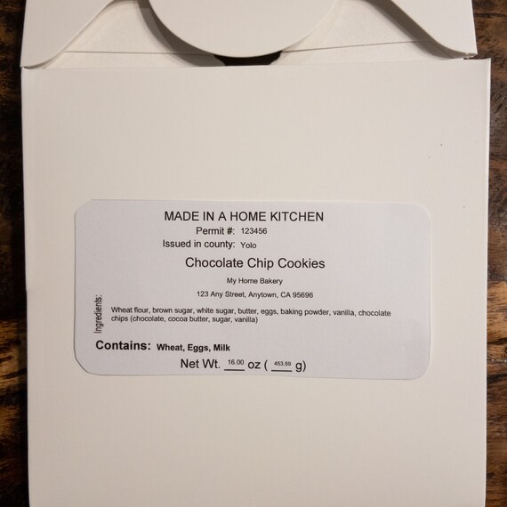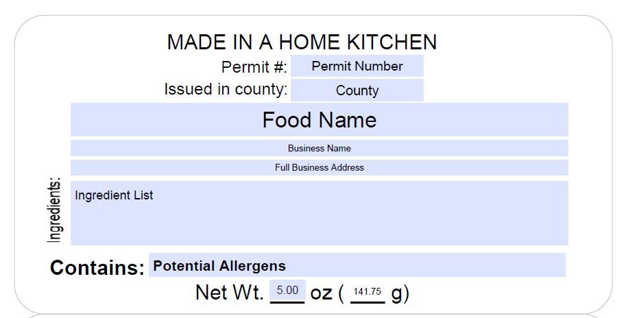 "Made in a Home Kitchen" Label - castiron.me When searching for a free cottage food label template online, ensure that it meets the requirements for home kitchen food labeling in the Sunshine state. First, you need a cottage food label example to affix to your products with the following information printed in English: Name and address of your cottage food operation; Name of the product (chocolate cookies, red velvet cake, etc.)
