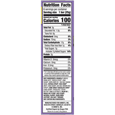Cascadian Farm Organic Granola Bars, Chocolate Chip Chewy Granola Bars … And, of course, this bar is processed food, which is never truly healthy, no matter what the label says. These are the nutrition facts: Total Fat 3.5 g Total Carbs 25 g (1 g fiber) (Sugars 12 g) Protein 2 g Here is a list of the positives of this bar: The ingredients are organic. It contains whole grains. There are no hydrogenated fats in it.