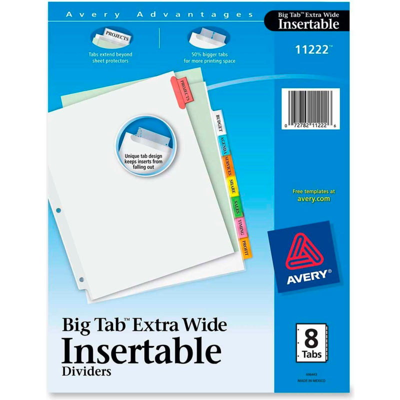 Avery WorkSaver Big Tab Insertable Tab Divider - LD Products $3.09 In stock Add to Cart The Avery Big Tab Divider offers tabs and inserts 50% larger than the original tabs. For those who crave neat and tidy organized binders, Avery tabs provide templates on Microsoft word to generate personalized tab inserts using a laser or inkjet printer.