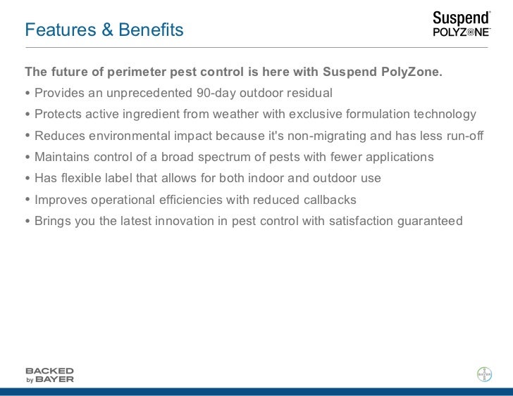 Suspend Polyzone - Do It Yourself Pest Control Featured Suspend Polyzone Benefits Proprietary, exclusive technology helps the active ingredient stay in place. Increased effectiveness Better, more uniform distribution of active ingredient particles than possible with conventional SC formulations. May be used indoors or outdoors Suspend Polyzone Adheres to Concrete