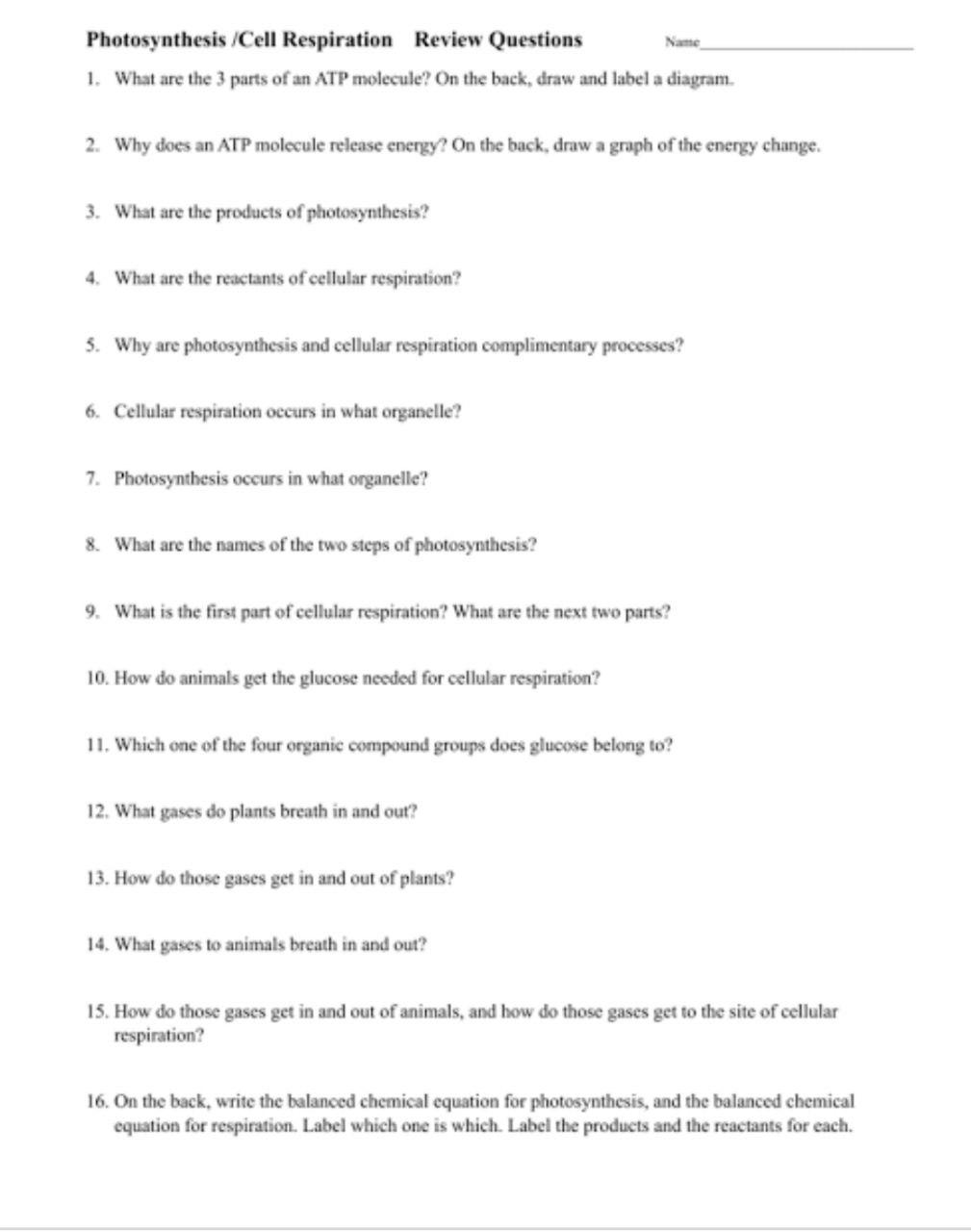 Ryan Barker - Photo and Resp Review.pdf - Cellular... Draw and label the ATP molecule 2. How does ATP release energy? 3. Define heterotrophs and provide an example of each. 4. Define autotrophs and provide an example of each. 5. Write the chemical equation for photosynthesis. 6. Where do the light-dependent reactions take place? 7.