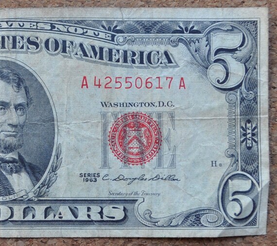 1963 5 Dollar Bill Red Seal | eBay Vintage $5 FIVE DOLLAR BILL Red Seal Circulated 1963 miscut on left side. $10.50 + $1.00 shipping. Picture Information. Picture 1 of 2. Click to enlarge. Hover to zoom. What is the value of a 1963 $5 bill with a red ink seal? There were over 63 million 1963 five dollar red seal legal tender notes printed. Today you can buy a circulated 1963 $5 for around six dollars. Uncirculated 1963 five dollar red seals trade for around $15. Brian Holland Former lawyer now retired (1987–2014) Author has 134 answers and 168.5K answer views 4 y