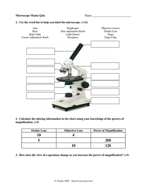 Use the word list to help you label the microscope. (+12) Microscope Mania Quiz Name _____ Use the word list to help you label the microscope. (+12) Arm Base Body Tube Coarse Adjustment Knob Diaphragm Fine Adjustment Knob Light Source Nosepiece Objective Lenses Ocular Lens Stage Stage Clips . Title: Microsoft Word - Microscope Basics Quiz Basic.doc ...